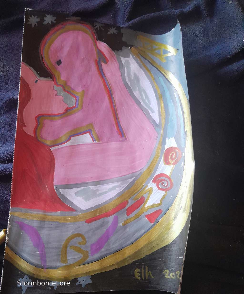 A mother cradles her child beneath the glow of moon and stars, framed in swirling gold. This piece speaks of tenderness, resilience, and the eternal bond between generations.