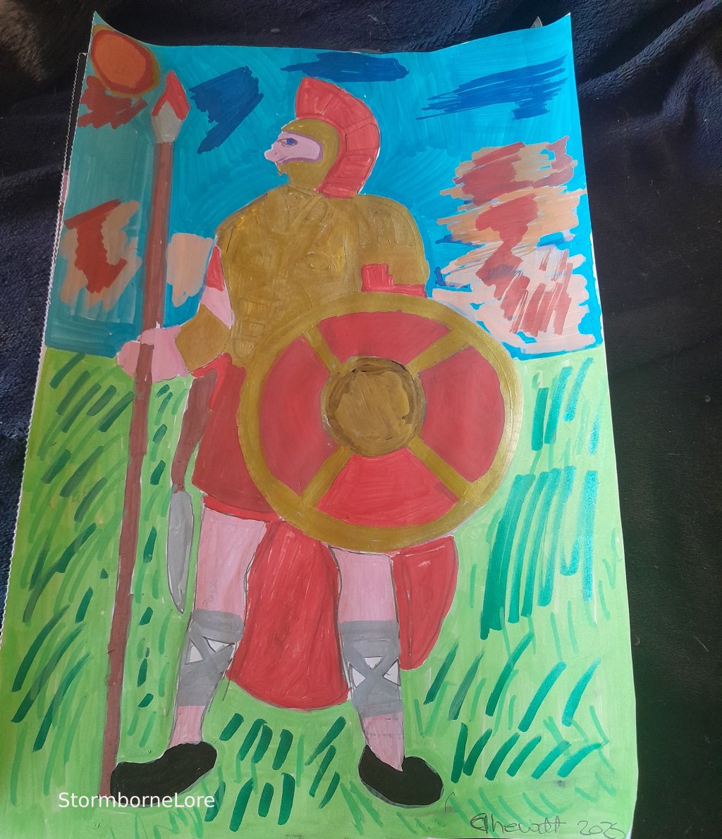 A lone Roman soldier stands vigilant against a stormy sky, spear and shield at the ready. The piece captures both the strength and fragility of empire one figure set against the vast shifting forces of history.