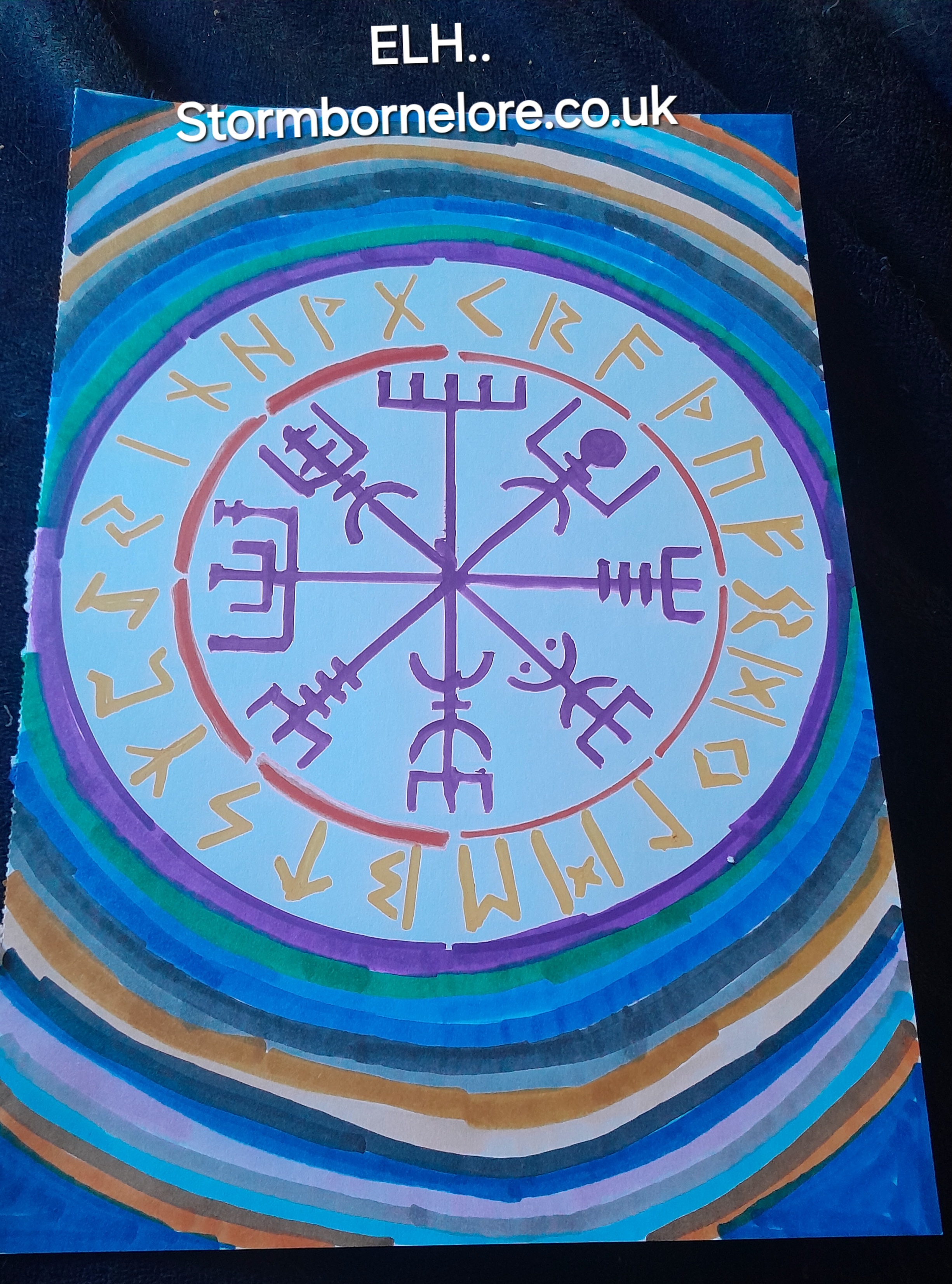 This painting blends ancient Norse-inspired runes with layered storm-coloured rings, echoing the guidance of the Vegvísir the wayfinder. In the StormborneLore world, it speaks of journeys through shadow and exile, always guided by unseen forces © StormborneLore – Emma Hewitt 2025. For more Art please see Stormborne Arts